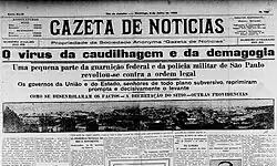 A "censura de imprensa no incitamento à anarquia e ao crime", nas palavras do presidente Bernardes, foi uma das atividades permitidas pelo estado de sítio.[188] Periódicos foram submetidos a processos criminais, e jornalistas foram agredidos e presos.[189] A partir de julho de 1924, o governo federal controlou as notícias nos principais jornais do país para abafar a repercussão das rebeliões. As informações eram liberadas de três a quinze dias após os eventos, e com forte viés pró-governo.[190] As notícias da Campanha do Paraná chegavam à imprensa com semanas de atraso e os censores, após a aprovação, não permitiam nenhuma mudança, nem mesmo para substituir a palavra "ontem".[191] Um visto da mesa das casas legislativas era necessário para a liberação à imprensa dos debates parlamentares. Após a definição de Washington Luís como candidato situacionista para a eleição presidencial de 1926, deputados denunciaram que os jornais estavam proibidos de criticá-lo.[192]