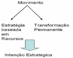 Na evolução do pensamento sobre estratégia organizacional podemos distinguir dois momentos: o momento do posicionamento e o momento do movimento. No primeiro momento a estratégia organizacional pressupõe uma adaptação ao meio envolvente para deste modo adquirir uma posição dominante e proceder seguidamente à sua defesa. Este momento inicia-se com a análise das oportunidades, ameaças, pontos fortes e fraquezas (análise SWOT). O segundo momento da estratégia organizacional assume-se como uma ruptura, colocando em evidência uma estratégia centrada na intenção e no movimento. Neste segundo momento, a estratégia visa essencialmente à transformação permanente do jogo concorrencial e da própria empresa.entre outras situações que não serão irrelevantes apontar pois não houve estudo o suficiente para esta pesquisa