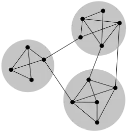 Nessa seção, vamos considerar apenas estruturas de comunidade disjuntas. Os primeiros trabalhos sobre estrutura comunitária disjunta assumiam que as comunidades eram cliques[1]. De fato, cliques são subgrafos densos na rede, isso constitui uma comunidade. Por outro lado, definir comunidades somente como cliques é muito restritivo porque geralmente em redes complexas é raro cliques de número de nós superiores a três e podemos deixar de classificar comunidades legítimas[2]. Por exemplo, na Fig. 1 à direita, nenhuma das comunidades destacadas são cliques.