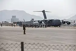 - ↑ Pawlyk, Oriana; Seligman, Lara (16 de agosto de 2021). «Body of dead Afghan found in landing gear of military jet leaving Kabul airport». Politico. Consultado em 17 de agosto de 2021. Cópia arquivada em 17 de agosto de 2021