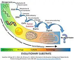 Argumenta-se que o próximo estágio da evolução sociocultural consistria na fusão da cultura com a tecnologia, especialmente a tecnologia de processamento da informação. Várias grandes transições cumulativas da evolução transformaram a vida por meio de inovações importantes no armazenamento e replicação de informações, incluindo RNA, DNA, multicelularidade e também linguagem e cultura como sistemas de processamento de informações inter-humanas.[39] Nesse sentido, pode-se argumentar que a biosfera baseada em carbono gerou um sistema cognitivo(humanos) capazes de criar tecnologia que resultará em uma transição evolutiva comparável. "A informação digital atingiu uma magnitude semelhante à informação na biosfera. Ela aumenta exponencialmente, exibe replicação de alta fidelidade, evolui através de aptidão diferencial, é expressa através de inteligência artificial (IA) e tem facilidade para recombinação virtualmente ilimitada. Como transições evolutivas anteriores, a simbiose potencial entre a informação biológica e digital chegará a um ponto crítico onde esses códigos podem competir através da seleção natural. Alternativamente, essa fusão poderia criar um superorganismo de nível superior empregando uma divisão de trabalho de baixo conflito na execução de tarefas informacionais. Processo em que humanos já realizam fusões de biologia e tecnologia já estão ocorrendo. Passamos a maior parte do tempo acordados nos comunicando por meio de canais mediados digitalmente, a maioria das transações no mercado de ações é executada por algoritmos de negociação automatizados e nossas redes elétricas estão nas mãos da inteligência artificial. Com um em cada três casamentos na América começando online, os algoritmos digitais também estão desempenhando um papel na ligação e reprodução de pares humanos".[39]