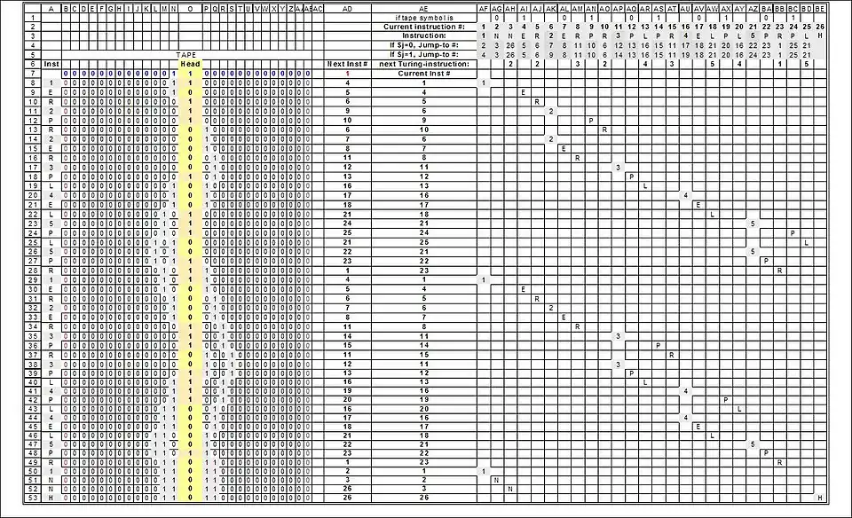 A "execução" completa do castor ocupado 3-estados. Os resultantes do estados de Turing (o que Turing denominados "configurações-m" & mdash; "máquinas-configurações") são mostrados em destaque em cinza na coluna A, e também sob instruções da máquina (colunas AF-AU))