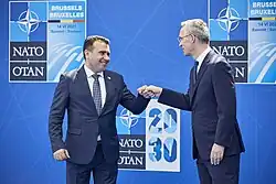 Em junho de 2017, o primeiro-ministro macedônio Zoran Zaev sinalizou que consideraria nomes alternativos para o país a fim de chegar a um acordo com a Grécia, resolver a disputa de nomes e levantar as objeções gregas à adesão da Macedônia à aliança. A disputa de nomes foi resolvida com o Acordo de Prespa em junho de 2018, sob o qual o país adotou o nome "Macedônia do Norte", o que foi apoiado por um referendo em setembro de 2018. A OTAN convidou a Macedônia do Norte a iniciar as negociações de adesão em 11 de julho de 2018,[52] sendo que conversas formais de adesão começaram em 18 de outubro de 2018.[53] Os membros da OTAN assinaram o protocolo de adesão da Macedônia do Norte em 6 de fevereiro de 2019[54] e a maioria dos países ratificou o tratado de adesão em 2019, com a Espanha ratificando seu protocolo de adesão em março de 2020.[55] A Sobranie também ratificou o tratado por unanimidade em 11 de fevereiro de 2020[56] e a Macedônia do Norte tornou-se um Estado-membro da OTAN em 27 de março de 2020.[57][58]