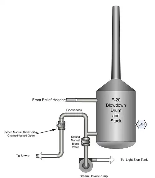 Vapores e líquidos excedentes de hidrocarbonetos provenientes de ventilação e alívio eram direcionados para o recipiente F-20, uma chaminé de descarga. Este foi projetado para dispersar vapores pelo topo e conduzir líquidos por meio de um tubo em forma de pescoço de ganso para a rede de esgoto fechada da planta.[b] O F-20 era um tambor vertical de 3 m de diâmetro com um tubo de exaustão vertical de 34 m. Foi colocado em operação na década de 1950 e passou por várias modificações ao longo dos anos.[31]
