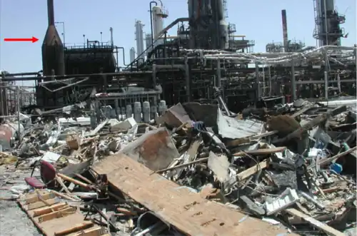 - Em 10 de agosto de 2005, uma unidade de gasóleo desenvolveu um vazamento causado por corrosão e sulfidação [en] em alta temperatura, resultando na liberação de gases tóxicos, incluindo monóxido de carbono (CO), sulfeto de hidrogênio (H2S) e dióxido de enxofre (SO2), além de vapores de hidrocarbonetos inflamáveis.[99][100] Os danos materiais foram de cerca de 2 milhões de dólares.[101]