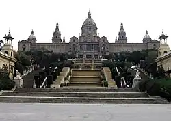 - Palácio Nacional: edifício principal da Exposição, foi obra de Eugenio Cendoya e Enric Catà, sob a supervisão de Pere Domènech i Roura, desestimando o projeto inicial de Puig i Cadafalch e Guillem Busquets. Construído entre 1926 e 1929, tem uma superfície de 32 000 m². De estilo classicista inspirado no Renascimento espanhol, tem planta retangular com dois corpos laterais e um posterior quadrado, com uma grande cúpula elíptica na parte central. As cascadas e surtidores da escadaria do Palácio foram obra novamente de Carles Buïgas, e foram colocados nove grandes projetores que ainda hoje emitem uns intensos feixes de luz que escrevem o nome da cidade no céu. No seu salão Oval foi efetuada a cerimônia de inauguração, presidida por Afonso XIII e a rainha Vitória Eugenia. O Palácio Nacional foi dedicado a uma exposição de arte espanhol com mais de 5.000 obras procedentes de todo o território do estado. Na sua decoração –em estilo novecentista, contrariamente ao classicismo da obra arquitetônica–, intervieram diversos artistas, como os escultores Enric Casanovas, Josep Dunyach, Frederic Marès e Josep Llimona, e os pintores Francesc d'Assís Gali, Josep de Togores, Manuel Humbert, Josep Obiols, Joan Colom e Francesc Labarta. De 1934 acolhe o Museu Nacional de Arte da Catalunha.[21]
