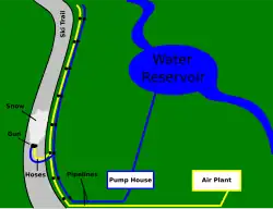A produção de neve começa com o abastecimento de água, como em um rio ou reservatório. A água é bombeada por uma rede de tubulações na montanha usando grandes bombas elétricas a partir de uma casa de bombas. Essa água é distribuída através de uma complexa série de válvulas e canos em direção a qualquer pista que exija neve. A maioria dos resorts também adiciona um agente nucleante para garantir que o máximo de água possível congele e se transforme em neve. Esses produtos são materiais orgânicos ou inorgânicos que facilitam às moléculas de água a formação adequada para congelar em cristais de gelo. Os produtos não são tóxicos e são biodegradáveis.