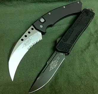 Devido ao seu modo de operação, a faca automática também é conhecida como: "navalha de ponta e mola" (em Portugal), "faca de travamento", "faca de botão", "faca ejetora", "faca de mola" (Sprenger,[1]Springer[2][3]), "faca dobrável" ou "lâmina dobrável") é um tipo de faca com uma lâmina deslizante contida no cabo que é estendida automaticamente por uma mola quando um botão, alavanca ou interruptor no cabo é ativado. A maioria dos designs de canivete incorpora uma "lâmina de travamento", na qual a lâmina é travada contra o fechamento quando a lâmina é estendida para a posição totalmente aberta. É desbloqueado por um mecanismo que permite que a lâmina seja dobrada e travada na posição fechada. Existem duas variantes de facas automáticas: a de abertura lateral ("side opening") e a de abertura frontal ("out the front" - OTF).