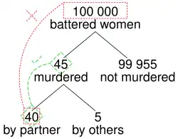 No mesmo julgamento, a acusação apresentou provas de que Simpson tinha sido violento com a sua esposa. A defesa argumentou que houve apenas uma mulher assassinada para cada 2.500 mulheres submetidas a abuso conjugal e que qualquer histórico de violência de Simpson contra sua esposa era irrelevante para o julgamento. Contudo, o raciocínio por trás do cálculo da defesa era falacioso. Segundo o autor Gerd Gigerenzer, a probabilidade correta requer contexto adicional: a esposa de Simpson não só foi submetida à violência doméstica, mas também submetida à violência doméstica (por Simpson) e morta (por alguém). Gigerenzer escreve "as chances de um agressor realmente ter assassinado sua parceira, visto que ela foi morta, são de cerca de 8 em 9 ou aproximadamente 90%".[16] Embora a maioria dos casos de abuso conjugal não termine em homicídio, na maioria dos casos de homicídio em que existe um histórico de abuso conjugal ele foi cometido pelo cônjuge.