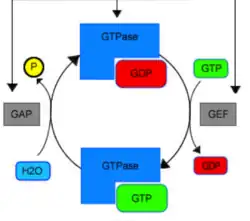 A dissociação de GDP de GTPases inativas ocorre lentamente.[3] A ligação de GEFs às suas GTPases-alvo catalisa a dissociação do GDP, permitindo a ligação de uma molécula de GTP em seu lugar. Como a razão citosólica de GTPːGDP é, em geral, de 10:1, a ligação ao GTP é favorecida.[4] A ligação do GTP à GTPase leva à liberação do GEF, que pode então ativar outra GTPase.[5][6] Sendo assim, os GEFs desestabilizam a interação das GTPases com GDP e estabilizam a GTPase livre até a ligação do GTP .[7] As GAPs (proteínas ativadoras de GTPase) agem de forma antagonista para inativar GTPS, aumentando a taxa intrínseca de hidrólise de ATP. O GDP permanece, então, ligado à GTPase inativa até a ligação de um GEF, com consequente liberação do GDP. .[3]