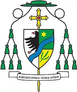 Blazon: em quarteirões, nos campos 1 e 4 em ouro, um bar vermelho, campo 2 em azul, uma águia blindada de prata com voos ascendentes, campo 3 em verde, um feixe de ouro de sete horas. Exemplo: chapéu de sacerdote verde com 1 2 3 borlas, atrás do escudo de ouro dourado Vortragekreuz. Lema: Annuntiamus vobis vitam.