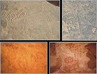 As gravuras rupestres mostram animais salpicados com palavras ou símbolos em caracteres tifinagues, a escrita dos berberes, o que atesta que já então a região era habitada por berberes. As gravuras encontram-se em Tadrart n Hammou Hakkou Cheda (garganta de Zenaga), Ighzer Acherquiy e El Arja.[nt 2]