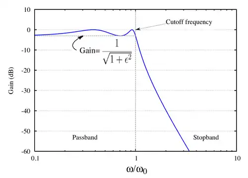 em que e é a amplificação na frequência de corte (nota: a definição comum na frequência de corte como a frequência com um ganho de −3 dB não se aplica aos filtros Chebyshev), e é um polinomial de Chebyshev da ésima ordem, como por exemplo: