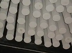 - Mangas filtrantes : São cilindros que permitem a passagem do ar, enquanto retém as particulas sólidas. Com o tempo ficam impregnadas de partículas, sendo necessário realizar a higienização, que pode ser feita através de jatos de ar comprimido ou com lavagem das mangas. Várias mangas independentes entre si são utilizadas na composição de um filtro. Podem ser construídas de tecidos ou materiais cerâmicos porosos.[4]