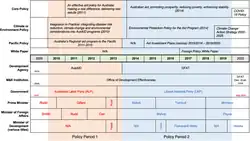 Analistas também apontaram uma reorientação estratégica da Austrália após o Acordo de Paris, dando maior foco a investimentos Sudeste Asiático, enquanto iniciativas críticas para os países insulares do Pacífico, como a infraestrutura hídrica resiliente em Fiji, passaram a depender cada vez mais de fundos multilaterais como Fundo Verde para o Clima. A decisão australiana em não integrar o Fundo Verde até 2018 reforçou percepções de descompromisso com a justiça climática regional.[22] Enquanto isso, a ajuda bilateral manteve-se concentrada em infraestrutura de baixa complexidade, como portos e estradas, com questionamentos sobre como tais projetos abordavam riscos climáticos de longo prazo.[22]