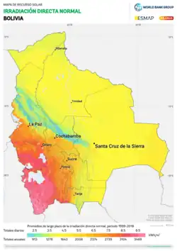 - ↑ Espinoza, Santiago (20 de maio de 2022). «Apesar de grande potencial, Bolívia enfrenta desafios para avançar com energia solar». Dialogue Earth. Consultado em 6 de maio de 2025