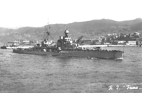 O Fiume foi um cruzador pesado operado pela Marinha Real Italiana e a segunda embarcação da Classe Zara, depois do Zara e seguido pelo Gorizia e Pola. Sua construção começou em abril de 1929 na Stabilimento Tecnico Triestino e foi lançado ao mar em abril de 1930, sendo comissionado na frota italiana em novembro do ano seguinte. Era armado com uma bateria principal composta por oito canhões de 203 milímetros montados em quatro torres de artilharia duplas, tinha um deslocamento de mais de catorze mil toneladas e conseguia alcançar uma velocidade máxima de 32 nós.