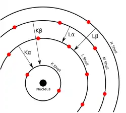 Essa radiação é característica do átomo, o que permite identificá-lo a partir da radiação que ele emite. Cada transição de camada possui seu nome e energia associada: da camada L para camada K (L→K) é denominada Kα, da camada M para K é Kβ; M→L é Lα, e assim por diante. Quando se realiza o bombardeamento de um material com raios X e se detecta a fluorescência, se observa uma combinação dessas linhas (mais comumente Kα e Kβ), e por meio de uma análise qualitativa é possível determinar a composição elementar do material[6].