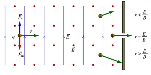 Um par de campos elétrico e magnético, uniformes e perpendiculares entre si podem ser usados para “filtrar” partículas com uma determinada velocidade. A figura ao lado mostra um filtro de velocidades, formado por um campo elétrico uniforme que aponta para cima, e um campo magnético uniforme que aponta para fora do papel.