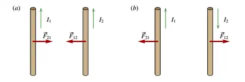 Calculando o sentido do campo produzido por cada condutor, e o sentido da força que esse campo exerce sobre o segundo condutor, conclui-se que a força entre dois fios com correntes no mesmo sentido é atrativa, e a força entre dois fios com correntes em sentidos opostos é repulsiva.[1]