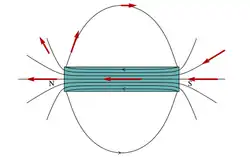 Aproximando uma bússola dos polos, consegue ver-se a direção das linhas de campo magnético; por convenção, as linhas de campo são no sentido em que aponta o polo norte da bússola; em cada ponto define-se um vetor de campo magnético, , com o sentido e direção da orientação da bússola.