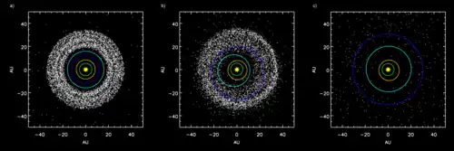 a) Antes de Júpiter/Saturno ressonância 2:1 b) Dispersão de objetos do cinturão de Kuiper no Sistema Solar após a mudança orbital de Netunoc) Após a ejeção dos corpos do cinturão de Kuiper por Júpiter