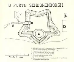 Com traçado de autoria do engenheiro inglês Richard Carr, as tropas de Matias Beck limparam o terreno a 9 de abril de 1649, erguendo uma cerca de pau-a-pique do dia 10 ao dia 22 do mesmo mês, deixando por instalar o portão e concluir duas baterias (GARRIDO, 1940:42). Inicialmente de madeira (estacas de carnaúba) e terra, sua planta apresentava a forma de um polígono pentagonal, cercado com parapeito e paliçada (BARRETTO, 1958:89), aproveitando material e artilharia do antigo Fortim de São Sebastião (GARRIDO, 1940:42). Foi batizado como Fort Schoonenborch, em homenagem ao governador neerlandês de Pernambuco, ficando guarnecido por quarenta homens e artilhado com onze peças de ferro (BARRETTO, 1958:89). De pequenas dimensões, Matias Beck determinou posteriormente a sua ampliação e reforço das obras de defesa, de acordo com a planta do mesmo engenheiro Caar, o que foi iniciado a 19 de agosto de 1649 (BARRETTO, 1958:89).