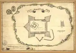 A praça de armas é dividida em duas áreas. A primeira corresponde a uma ampla plataforma lajeada, onde foram edificados os quartéis, depósito e cozinha. No espaço restante foi incorporado o convento, de estrutura sóbria e austera, de modelo chão, cujo conjunto é formado pela igreja, de planta longitudinal composta por nave única coberta por abóbada de berço e sacristia, e pelo claustro, de planta quadrangular, com alas compostas por colunatas jónicas.