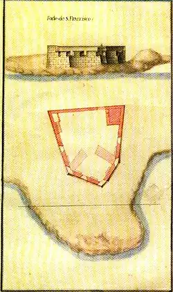 - "16º - Forte de São Francisco da Ribeira secca. Foi feito de novo a fundamento e falta-lhe a plataforma, tem seis canhoneiras e quatro peças de ferro capazes com os seus reparos bons, carece de mais duas peças com os seus reparos e para se guarnecer seis artilheiros e vinte e quatro auxiliares."[3]