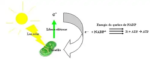 O processo pode ser entendido de forma simplificada quando ocorre a excitação dos cloroplastos pela luz, e liberam elétrons(e-) onde são "capturados" pela Adenosina-difosfato ou ADP, que se liga a um Pi(fosfato inorgânico) gerando Adenosina-trifosfato ou ATP.