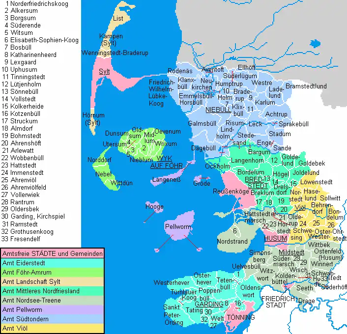 De aproximadamente 1200 até 1864, a área que hoje é Nordfriesland era uma parte do Ducado de Schleswig, que em si não era diretamente uma parte do Reino Dinamarquês, mas um feudo da coroa dinamarquesa e ligado aos reis da Dinamarca por união pessoal como uma entidade separada. Nordfriesland ainda é um distrito multilíngue: há pessoas falando alemão padrão, baixo alemão, frísio do norte e dinamarquês, incluindo a Jutlândia do Sul. A língua frísia do norte existe em nove dialetos ligeiramente diferentes, mas é usada principalmente por cidadãos mais velhos na Nordfriesland continental. Uma comunidade relativamente animada de falantes frísios existe nas ilhas de Föhr e Amrum. Depois de se tornar alemão, três distritos foram estabelecidos na região: Südtondern no norte, Husum no centro e Eiderstedt no sul. Em 1970, estes três distritos foram fundidos para formar o distrito de Nordfriesland.[3][4]