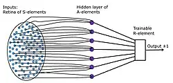 Rosenblatt é mais conhecido pelo Perceptron, um dispositivo eletrônico que foi construído de acordo com princípios biológicos e demonstrou capacidade de aprendizagem. Os perceptrons de Rosenblatt foram inicialmente simulados em um computador IBM 704 no Laboratório Aeronáutico Cornell em 1957.[5] Quando um triângulo era colocado diante do olho do perceptron, ele captava a imagem e a transmitia ao longo de uma sucessão aleatória de linhas para as unidades de resposta, onde a imagem era registrada.[6]