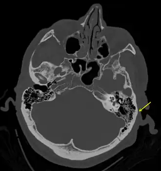 | Uma fratura sutil do osso temporal vista na TC de uma pessoa com traumatismo craniano grave | |