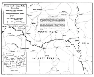 Essa fronteira entre duas colônias francesas da África Ocidental se concretizou com as independências de ambas em 1960. De 2002 a 2004, a fronteira esteve fechada em função da Guerra Civil Costa-Marfinesa. [2][3]