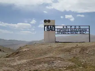 Vista do monumento no passo Kyzylart, na fronteira entre Quirguistão e Tajiquistão na estrada M41, nas montanhas Pamir; a inscrição em russo indica que "os habitantes do Alto Badakhshan vos recebem". | |