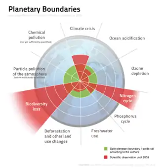 - ↑ a b c Rockström, J; Steffen, WL and 26 others (2009). «Planetary Boundaries: Exploring the Safe Operating Space for Humanity» (PDF). Ecology and Society. 14 (2). 32 páginas
