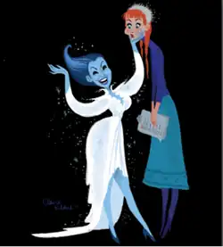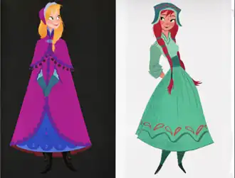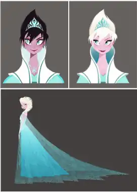 Arte conceitual de Claire Keane, quando Frozen era Anna and The Snow Queen, uma adaptação fiel do conto de Andersen. Elsa seria uma exagerada "show girl", de acordo com Keane, inspirada em Bette Midler com jeitos de Amy Winehouse.[19]