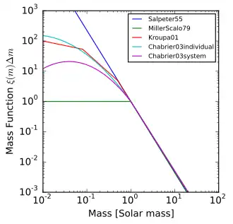 As formas comumente usadas do FMI são a lei de potência truncada de Kroupa (2001)[8] e a log-normal de Chabrier (2003).[2]