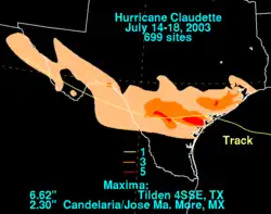 - ↑ a b National Weather Service, Corpus Christi, Texas Regional Office. «Hurricane Claudette July 15, 2003». National Oceanic and Atmospheric Administration. Consultado em 21 de junho de 2006. Cópia arquivada em 9 de outubro de 2007