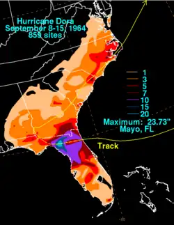 - ↑ a b Horace S. Carter (11 de setembro de 1964). Preliminary Report on Hurricane Dora (continued) (Relatório). Athens, Georgia. p. 2