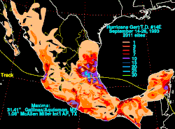 - ↑ a b c Gutiérrez, Prisciliano H.; Jiménez, Elias M.; de la Fuente, Rigoberto M.; Mendiola, Rubén Dario S. (dezembro de 1993). Las inundaciones causadas por el huracán "Gert" sus efectos en Hidalgo, San Luis Potosi, Tamaulipas y Veracruz. Centro Nacional de Prevención de Desastres; archived by Centro de Información Sobre Desastres Y Salud (em espanhol). Mexico City, Mexico: [s.n.] pp. 16, 17