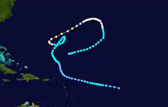 - ↑ a b c d e f g h i j Atlantic hurricane research division (2009). «Atlantic hurricane database (HURDAT) "best track" (1851–2008)». National Oceanic and Atmospheric Administrations. Consultado em 27 de janeiro de 2010