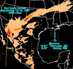 A humidade remanescente de Ismael estendeu-se pelo sudoeste do Arizona e pelo sul do Novo México. A tempestade caiu com grande precipitação próximo do Novo México/costa do Texas, com pico de 8.53 polegadas (217mm) em Hobbs, Novo Mexico.[9] Fontes não oficiais estimaram mais de 10 polegadas (250mm). A chuvarada deixou estradas e prédios inundados. Várias rodovias e estradas foram fechadas devido a crateras que surgiram. O prejuízo totalizou $250,000 (1995 USD) no Novo México.[10] Em Lubbock, Texas, a chuva se transformou em inundação rapidamente, fechando muitas estradas e cruzamentos.[11] Os resquícios de Ismael produziram mais 3 polegadas (76mm) de chuva no sudoeste de Oklahoma e norte do Arkansas,[9] com sua umidade se estendendo a leste através dos estados do Mid-Atlantic.[1]