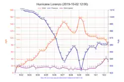 - ↑ Andrew Latto (25 de setembro de 2019). «Hurricane Lorenzo Discussion Number 13». www.nhc.noaa.gov. Miami, Flórida: National Hurricane Center. Consultado em 28 de setembro de 2019
