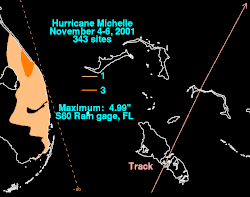 - ↑ a b Avila, Lixion A. (3 de novembro de 2001). «Hurricane Michelle Forecast/Advisory Number 18». Miami, Florida: United States National Oceanic and Atmospheric Administration's National Weather Service. Consultado em 20 de junho de 2013