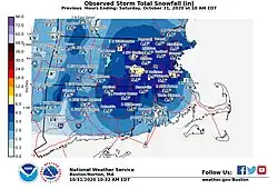 - ↑ «Who got the most snow in Massachusetts?». masslive. 30 de outubro de 2020. Consultado em 1 de novembro de 2020