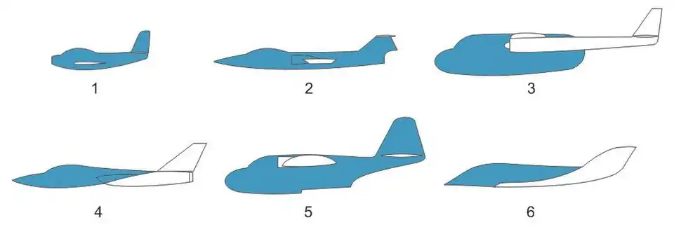 Há duas variantes: Monocoque e semimonocoque. Na fuselagem monocoque o casco é essencialmente uma fina parede tubular que suporta todos os esforços. Monocoque é uma palavra francesa que significa "single shell." Mais comum é a semimonocoque. Este casco é reforçado por longarinas. Anéis, cérceas e tabiques dão forma ao casco.
