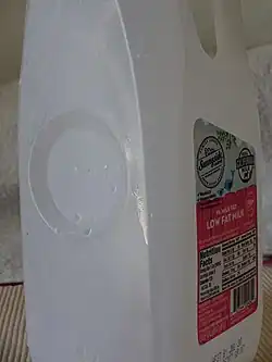 Garrafas de leite de plástico moldadas por sopro estão em uso desde a década de 1960.[3][4][5] O PEAD é o material primário, mas o poliéster também é usado.