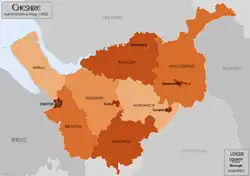Mapa Administrativo de CheshireDe acordo com a explicação de Samuel Maunder em 1853, "This phrase owes its origin to the unhappy attempts of a sign painter of that country to represent a lion rampant, which was the crest of an influential family, on the sign-boards of many of the inns. The resemblance of these lions to cats caused them to be generally called by the more ignoble name. A similar case is to be found in the village of Charlton, between Pewsey and Devizes, Wiltshire. A public-house by the roadside is commonly known by the name of “The Cat at Charlton”. The sign of the house was originally a lion or tiger, or some such animal – the crest of the family of Sir Edward Poore."[3] (ou seja, "Esta frase deve ter origem nas tentativas infelizes de um pintor de placas daquele país para representar um leão desenfreado, que era o brasão de uma família influente, nas tabuletas de muitas das pousadas. A semelhança desses leões com gatos fez com que eles fossem geralmente chamados pelo nome mais ignóbil. Um caso similar é encontrado na vila de Charlton`, entre Pewsey e Devizes. Um estabelecimento público na beira da estrada é comumente conhecido pelo nome de ´The Cat at Charltron". O letreiro da casa era inicialmente um leão ou um tigre, ou algum desses animais - o brasão de família de Sir Edward Poore." .