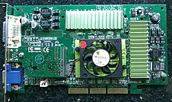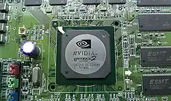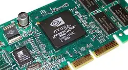 ![]() Nvidia GeForce 2 GTS com o seu cooler removido, mostrando a matriz NV15 | |